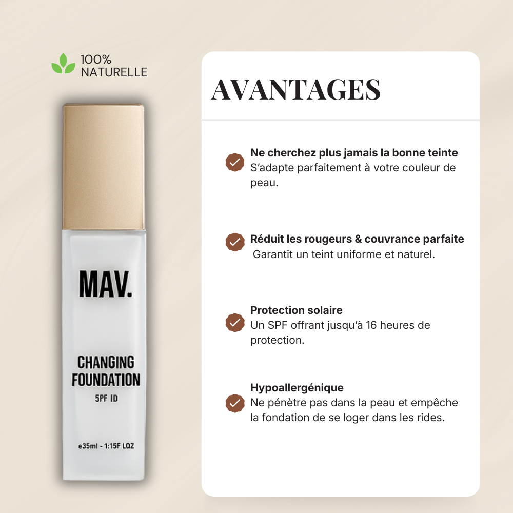Maman très prise je trouve jamais ma teinte trop clair ou trop orange. MAV s’adapte vraiment à ma peau, sans traces et sans effet masque je recommande.